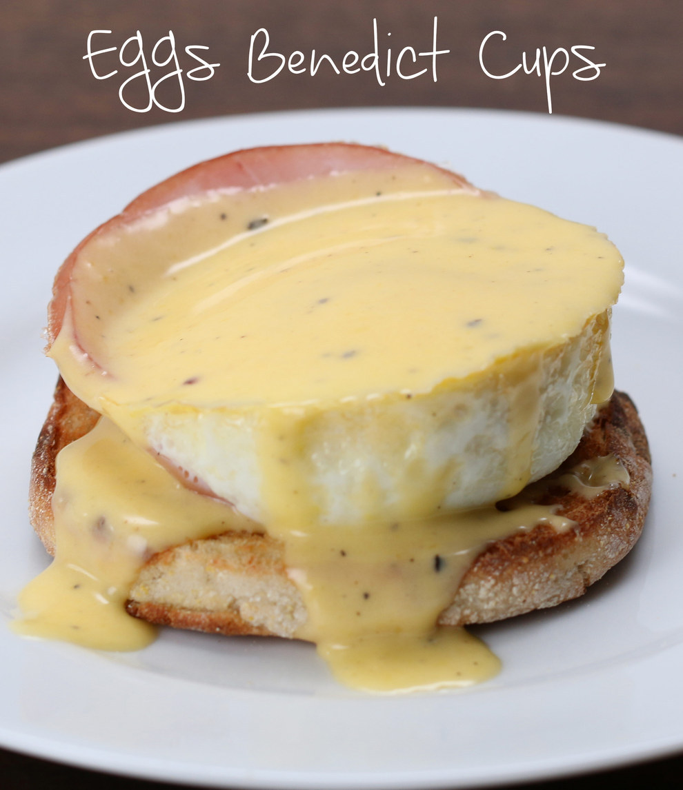 2. To plate: place a toasted English muffin half down, layer the ham and egg cup on top of the English muffin, then drizzle your hollandaise sauce over the egg.